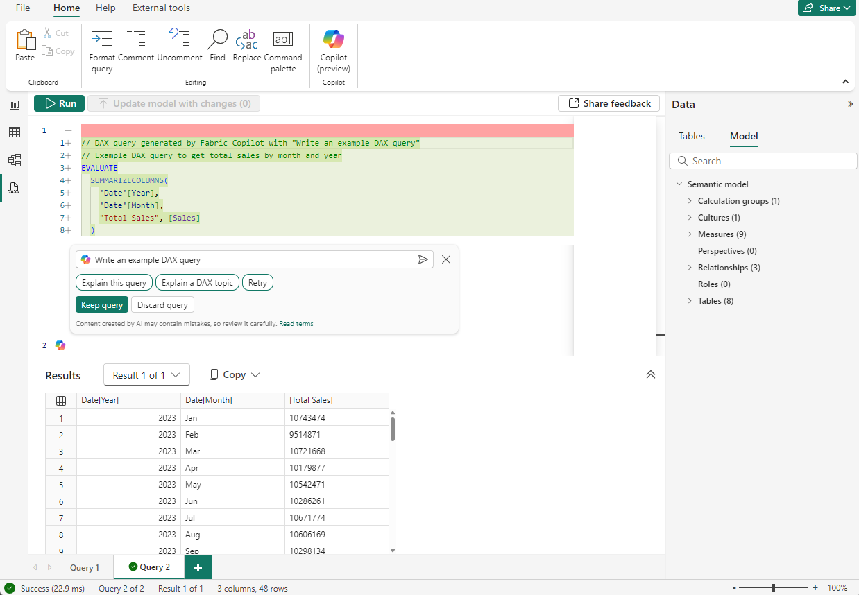 To use Copilot to create a DAX query, type in a prompt to describe what DAX query you would like generated and select Send or press Enter. Alternatively, you can click the Write DAX query inspire button. To run what is returned, select Run or press F5 to see the results of the DAX query. To keep the query and exit Copilot, select Keep query to add it to query tab.