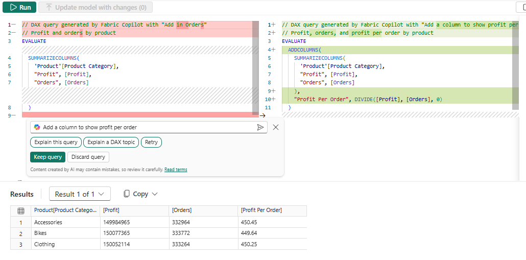 Now the diff styling in the DAX query editor shows exactly what Copilot has changed.