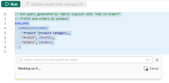 After the initial DAX query is generated, you can simply adjust by typing in additional user prompts.