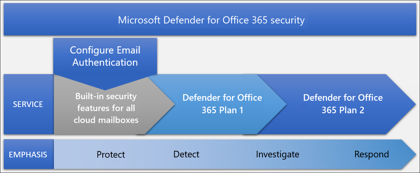 This article explains the protection ladder for email and collaboration. The ladder starts with the built-in security features for all cloud mailboxes, and continues to Defender for Office 365 Plan 1 and Defender for Office 365 Plan 2.