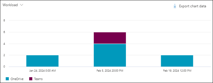 The Workload pivot organizes the chart by the location of the clicked URL (email, Office files, or Microsoft Teams) for the specified date/time range and property filters.