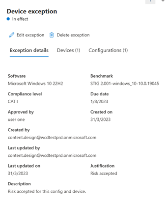Devices included in exceptions won't be assessed for the specified configurations in the baseline profiles. This means it won't affect an organization's metrics and score, and it can help provide organizations with a clearer view of their compliance.