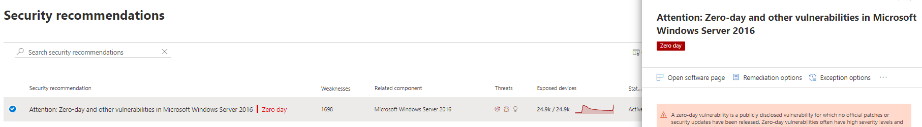 Go to the security recommendation page and select a recommendation with a zero-day. A flyout will open with information about the zero-day and other vulnerabilities for that software.
