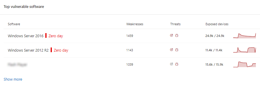 - Find top software with the Zero day tag in the Top vulnerable software card.
