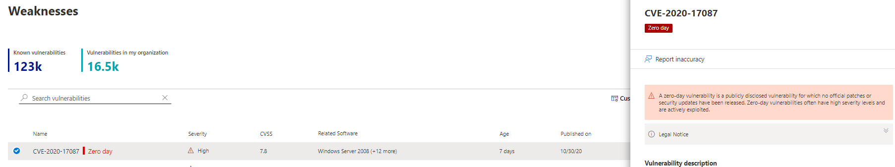 Once a zero-day vulnerability is found, information about it is conveyed through the following experiences in the Microsoft Defender portal.