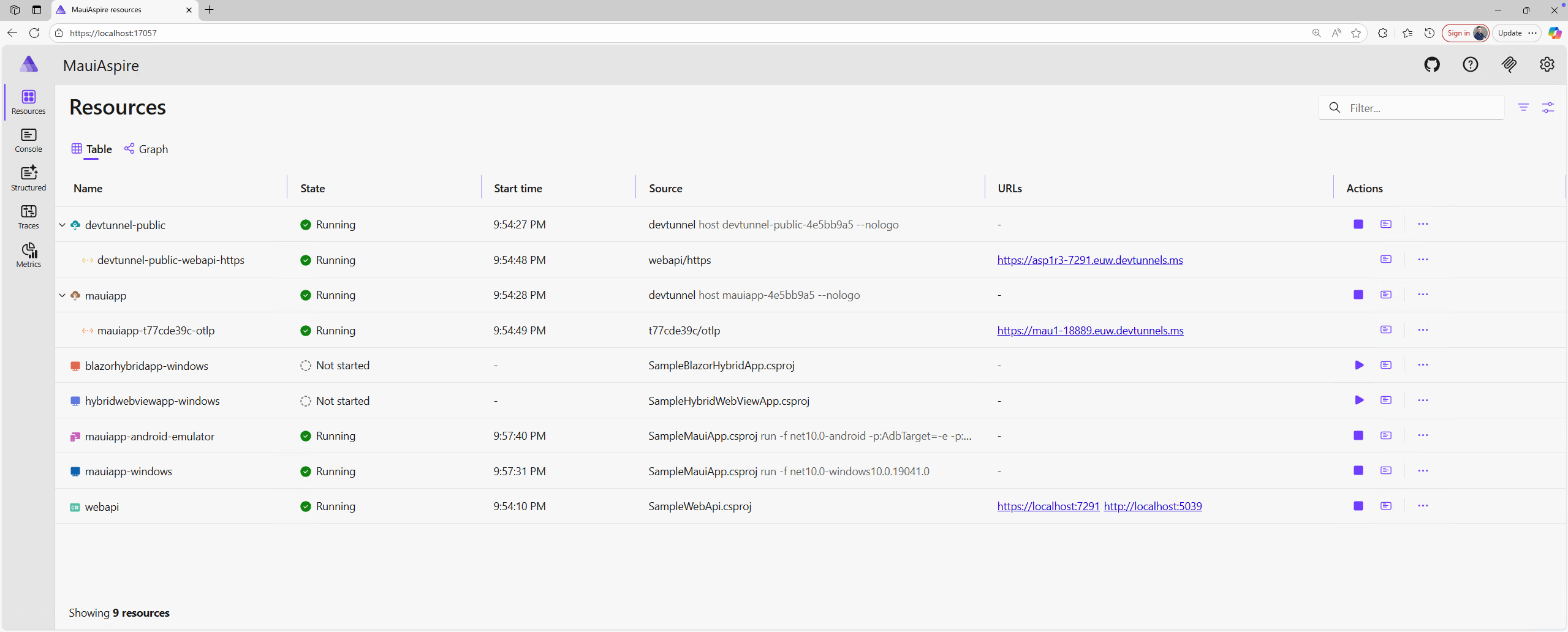 - Your MAUI app not will launch automatically. You can start each .NET MAUI target manually through the dashboard.