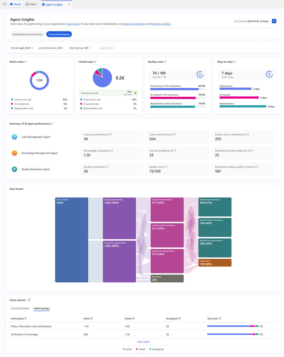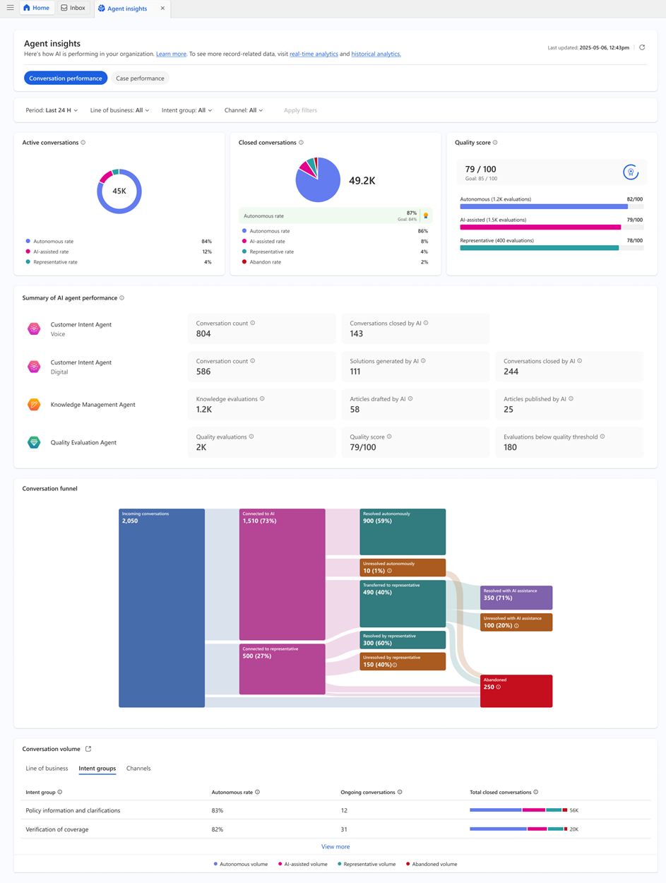 The Agent insights dashboard equips supervisors with real-time visibility into key performance indicators and operational trends regarding their AI agents. This information enables them to make confident and data-driven decisions throughout the autonomous transformation journey.