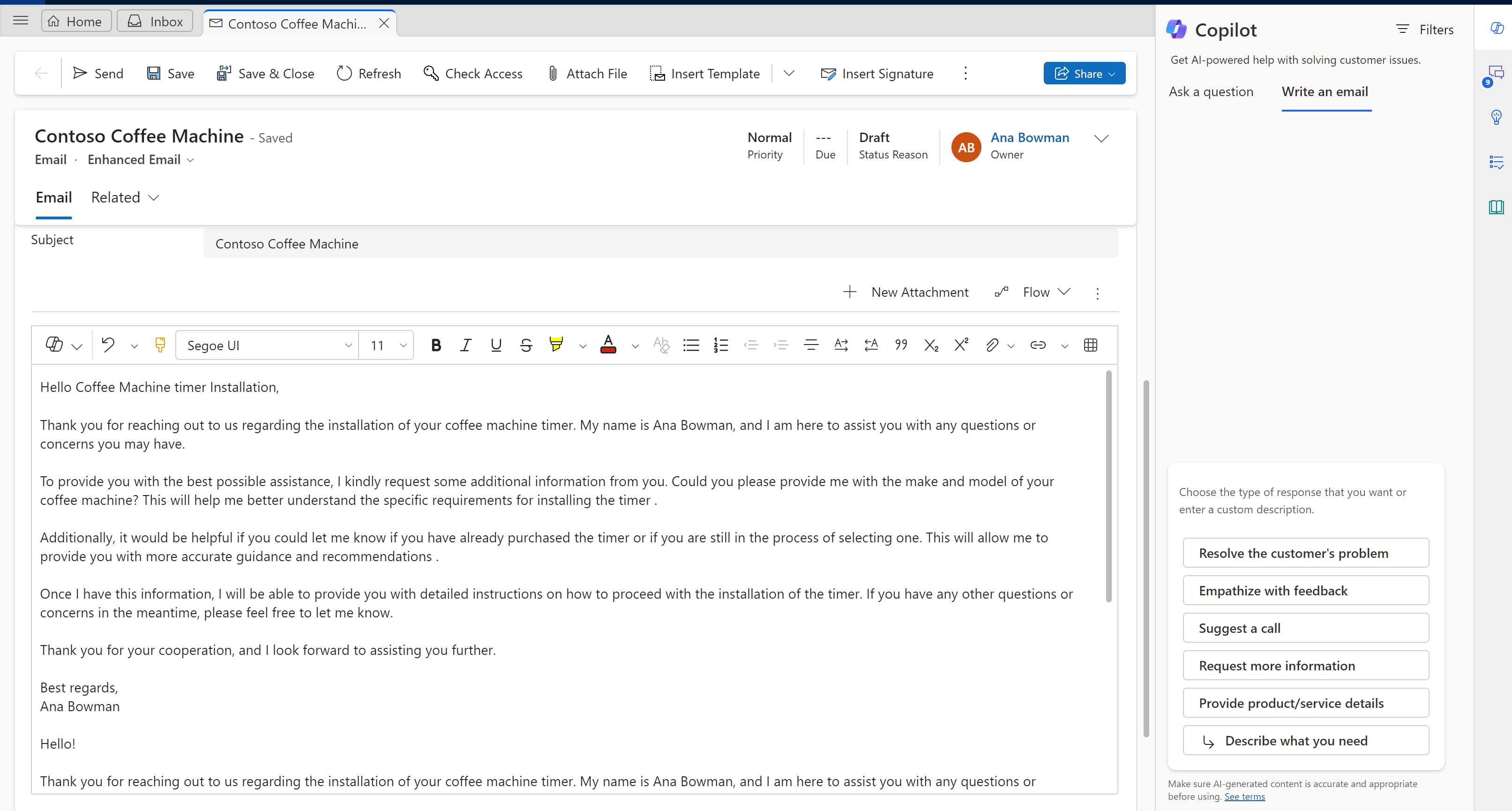 When you use Copilot to draft an email, you can use the following features to help you write a response to a customer.