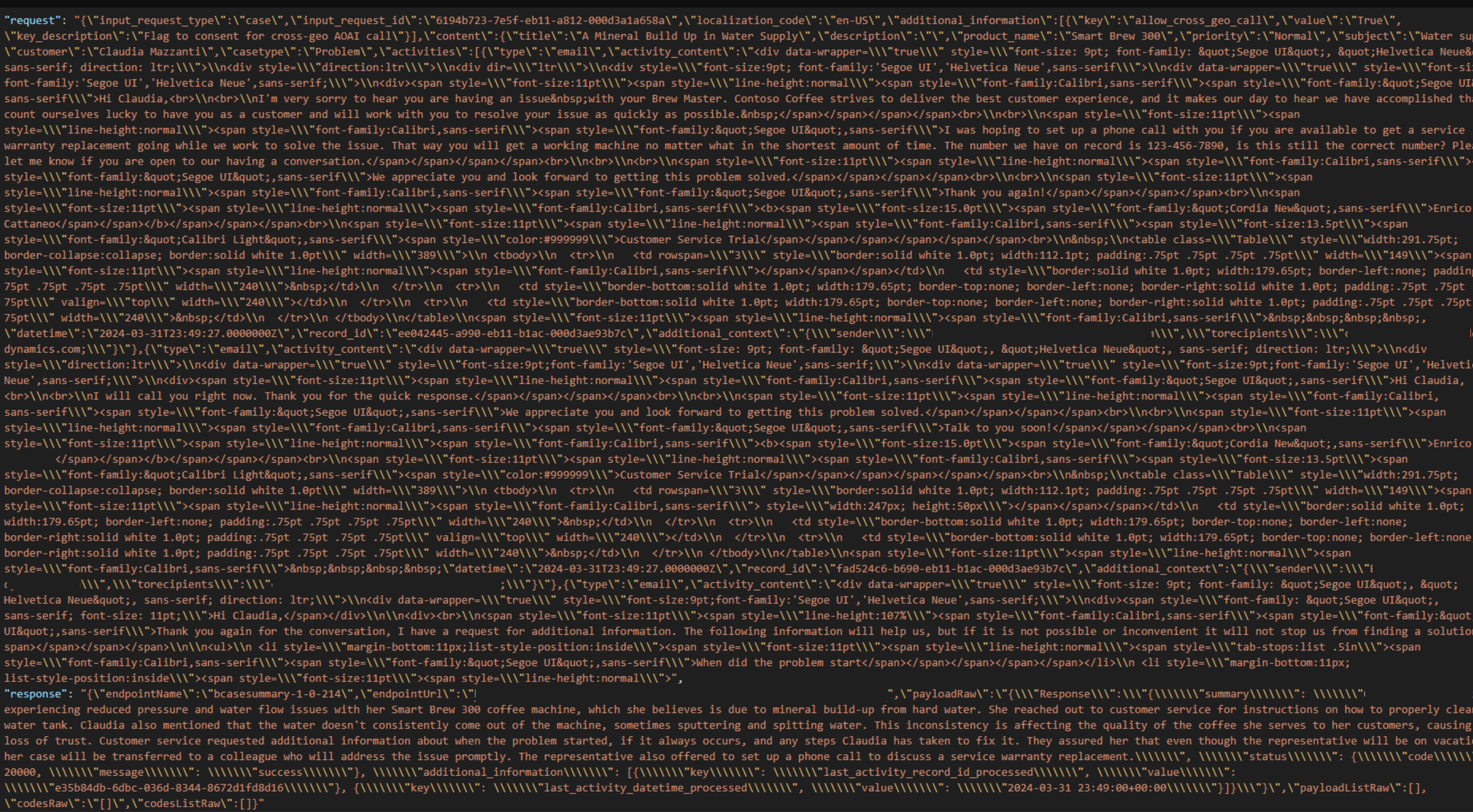 Ask a question, suggest a response, and draft an email features use the base64 encoder with the UTF-16LE character set. Case and conversation summary use UTF-8 character set. We recommend that you use the same character set that was used to encode data to decode it.
