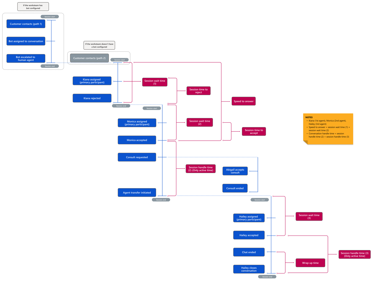 For every service representative who is identified to work on a conversation and associated with the latest session, a session participant entry is created. A single session can have multiple participants. Every session has one primary participant: the service representative who has the assigned work item. A session might then have many other participants who monitor the conversation or help with the consultation. Alternatively, the session might have no other participants. From this entity, you can get KPIs and metrics about consultations that service representatives provide and monitored conversations.