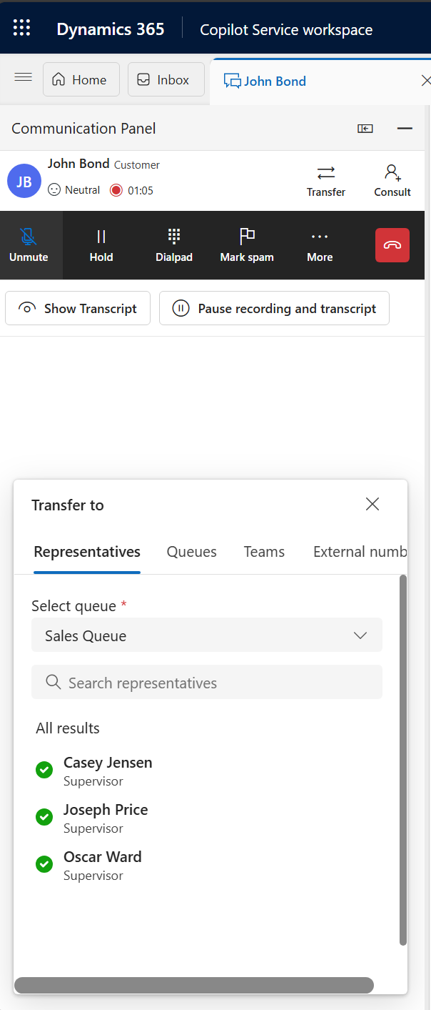 Transfer to a queue: Select Queue, search for the queue you want to transfer the call to, and then select Transfer. The customer is put on hold. The representative who picks up the transferred call becomes the primary representative and you become the secondary and are removed from the call.