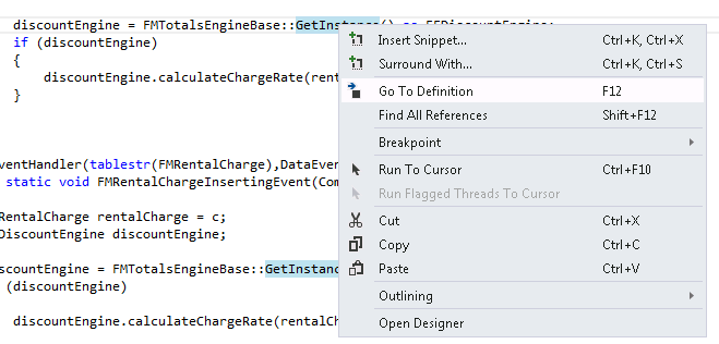 FMRentalCharge_Extension.xpp, right-click GetInstance, and then select Go To Definition. The code editor opens with the abstract class FMTotalsEngineBase. This abstract class is called a plugin point and it's associated with the following attribute: [Microsoft.Dynamics.AX.Platform.Extensibility.ExportInterfaceAttribute()]Plug-in classes represent extensions or implementations of abstract classes or interfaces. Plug-in classes are associated with attributes that define their metadata and the plug-in point. In this example, two plug-in classes are associated with the FMTotalsEngineBase plug-in point. The base calculation engine is defined by the plug-in class FMTotalsEngine. You can find it in the project FleetManagement Migrated > Code > Classes.