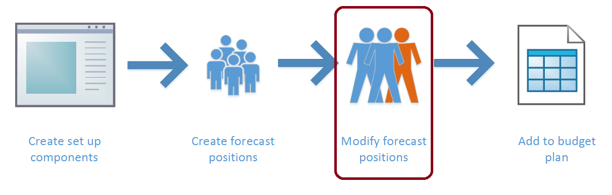 In a typical process for position forecasting, you first create the setup components (budget cost elements and compensation groups). Forecast positions are then generated, based on existing positions. You can then make adjustments. For example, you can add or end positions, change pay rates and benefit costs, and add wage increases. You can create multiple versions of a forecast position to facilitate comparisons between different budgeting scenarios. Next, you can include the forecast positions in budget plans and bring in the costs from the forecast positions as budget plan lines.