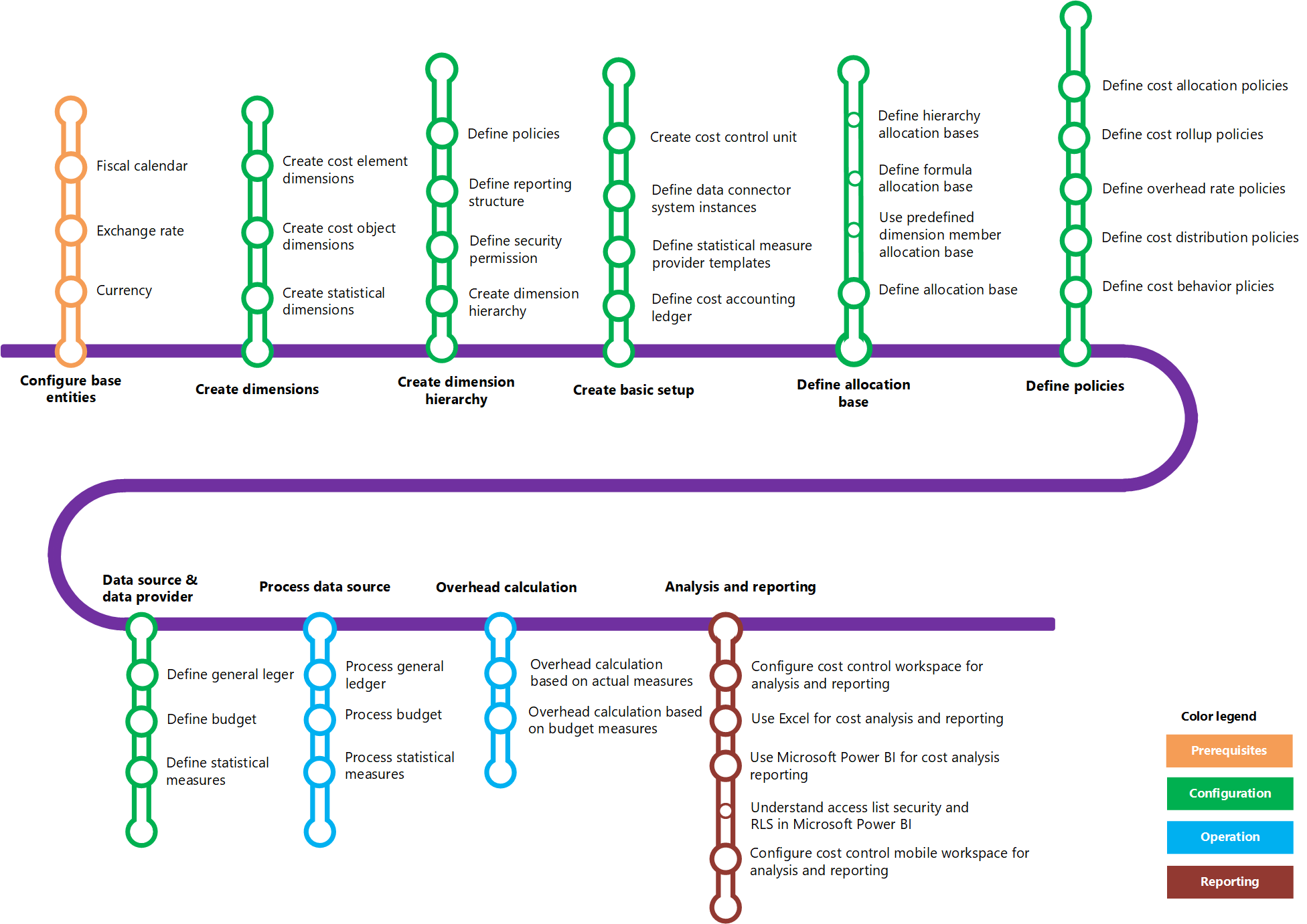 The following learning map shows the major concepts and tasks that make up the framework of the Cost accounting module. Click the links in the Quick links section to learn how to use the module.