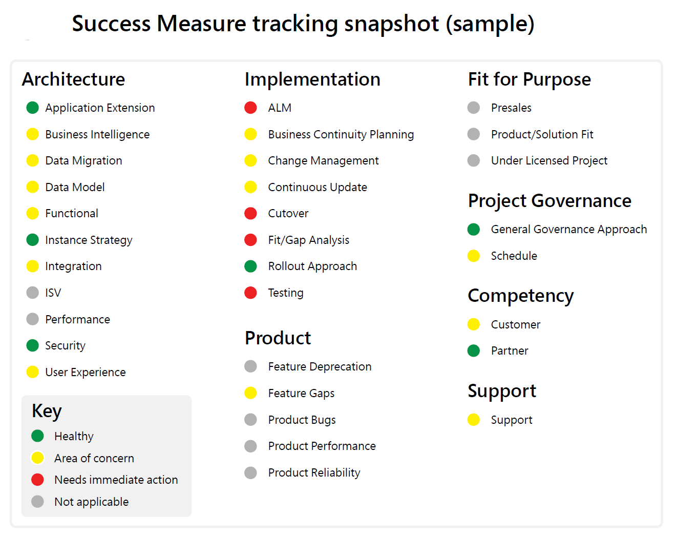 Tracking success measures is simple: After a Success by Design review or other compelling project event, your FastTrack Solution Architect or partner architect will access Microsoft's Success by Design tooling and update the relevant success measures for the project. Success measure updates are either red, yellow, or green, and include project-related details relevant to the success measure.