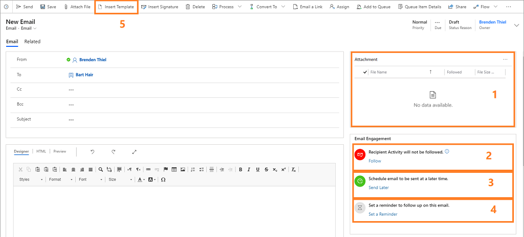 - Insert Template: Insert standard text that you can revise as needed. Your organization can have multiple templates depending on the business requirements, such as a meeting follow-up or an introduction. Email engagement suggests a template based on previous performance.