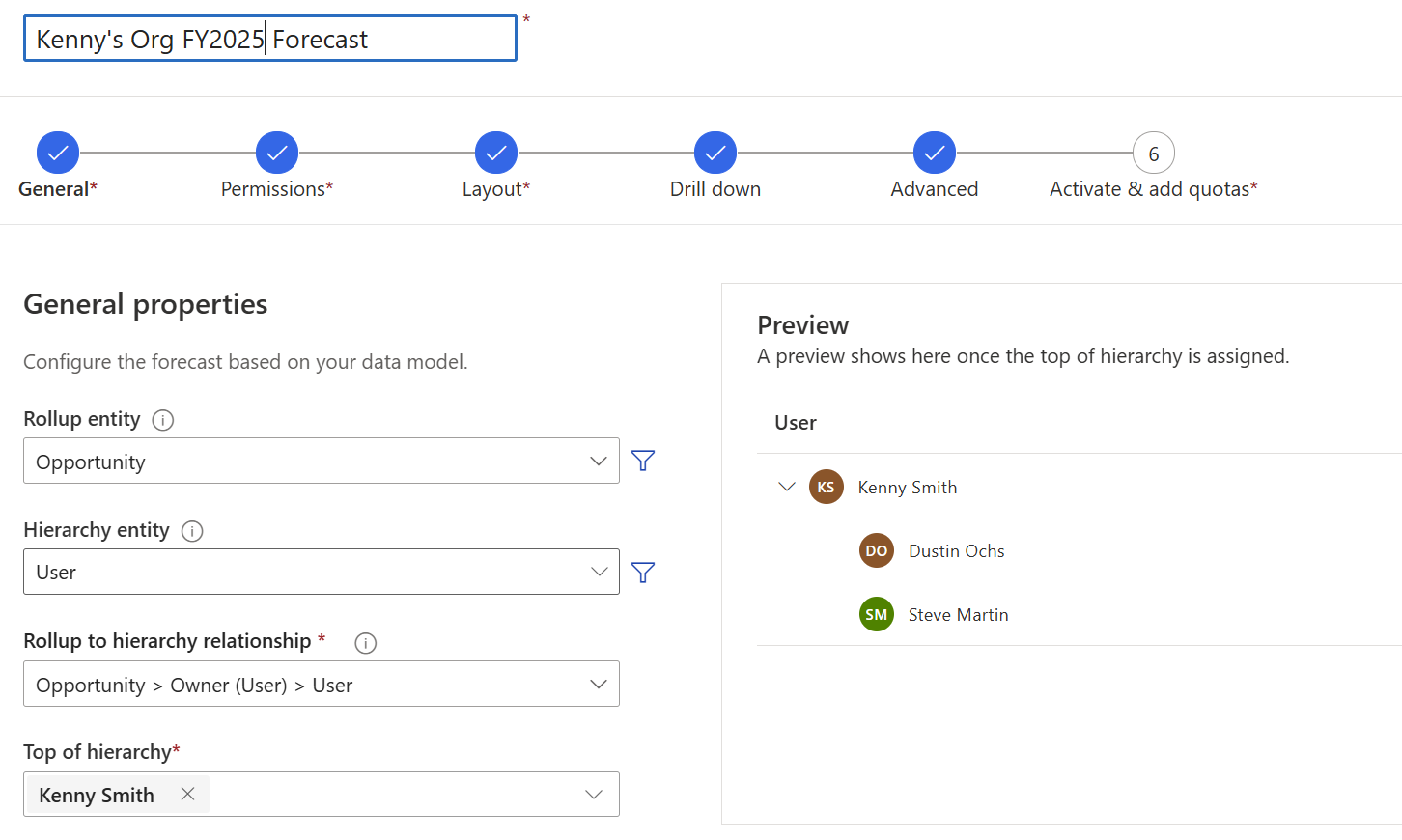 Let's say that Kenny Smith, a sales director, wants to see the forecast for their team. Kenny builds a forecast based on the Org chart template and selects their own name as the top of the hierarchy. The team's hierarchy is previewed to the right of the forecast options.