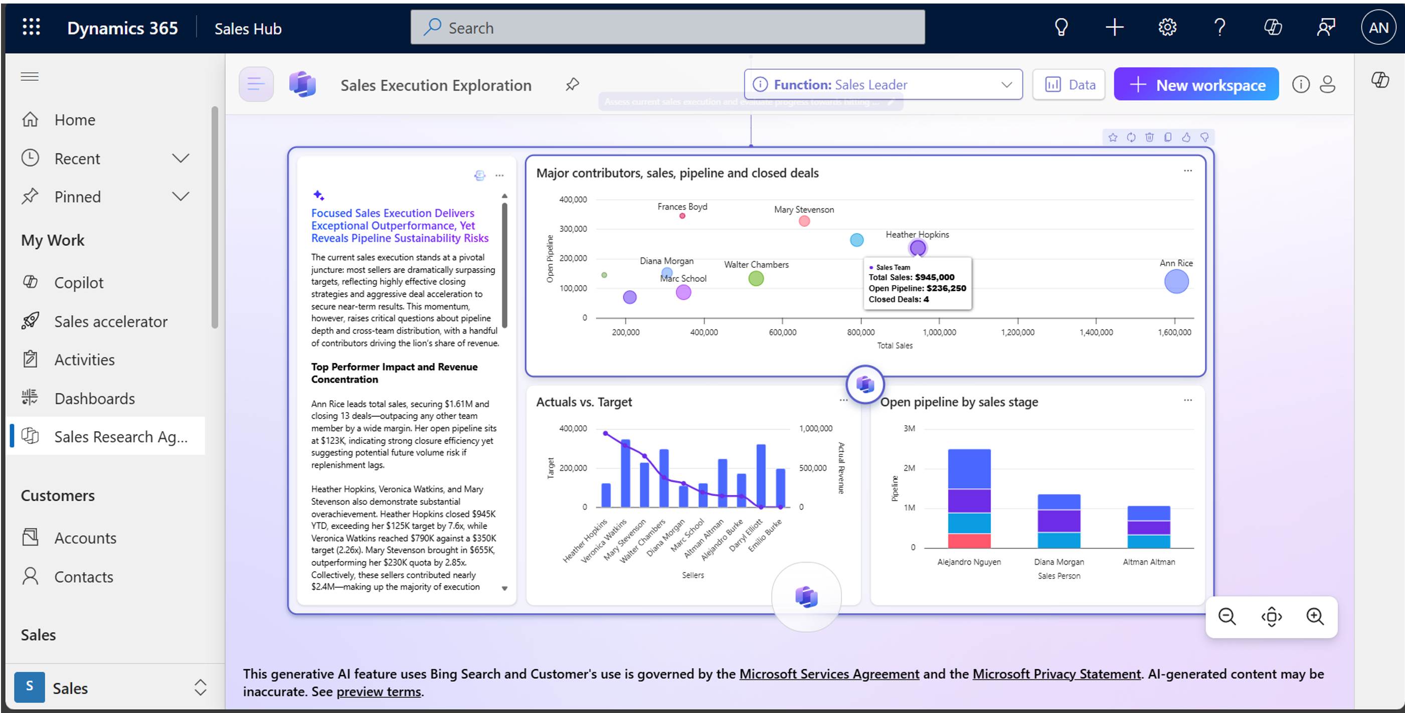 The Sales Research Agent in Dynamics 365 Sales empowers you to solve complex business questions through a dialog with your data using natural language. This AI-powered research canvas offers rich insights into all aspects of your sales data, empowering you to make informed decisions taking a myriad of variables into account. You can provide general and business context to the agent to improve the relevance and consistency of the content generated. Learn more in Provide context to enhance the Sales Research Agent.