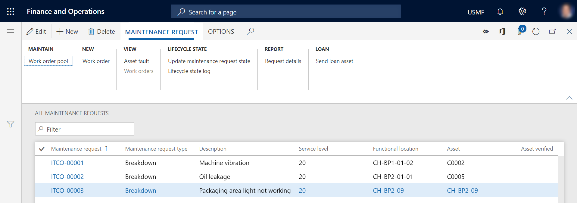 Use the My functional location maintenance requests list page to view a list of maintenance requests that contain either functional locations that you're related to as a worker or assets that are installed on functional locations that you're related to as a worker. (Read Maintenance workers and worker groups to learn more about how to set up functional locations on maintenance workers.)