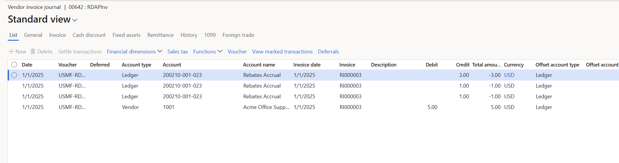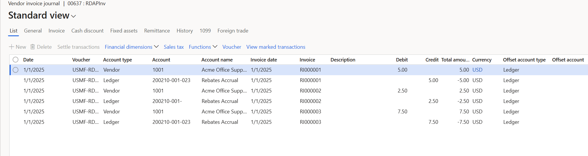 Because of the Process by dimension setting, the system divides the output. Each line shows a debit or credit account together with its ledger account code. This situation can cause reconciliation issues, especially when multiple lines point to the same vendor. To view the output, on the Action Pane, on the Rebate management deals tab, select Transactions.