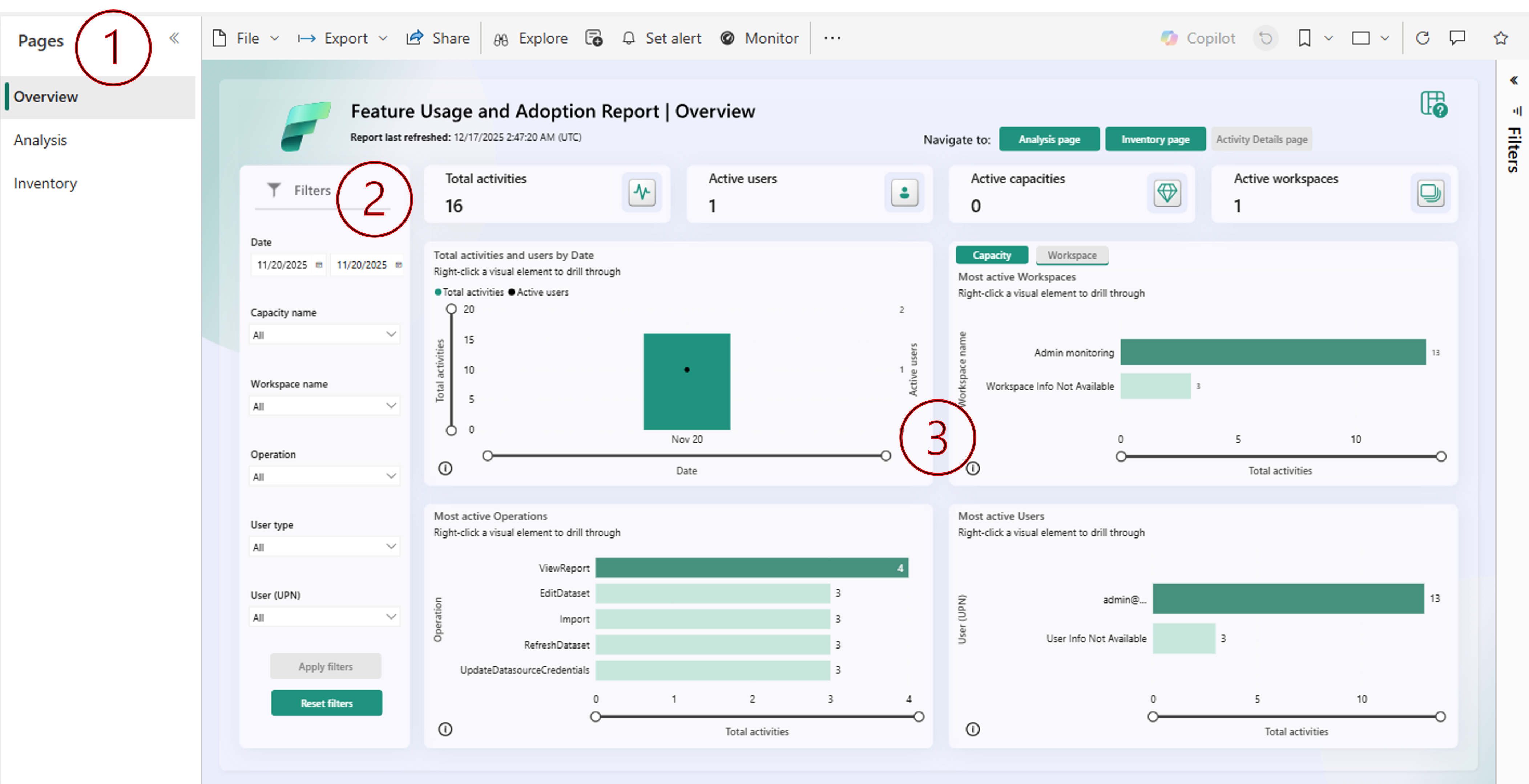 - Filters - Specify date ranges and apply filters to analyze Fabric activity based on different characteristics.