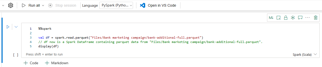 | %%spark | Scala | Execute a Scala query against Apache Spark Context. |