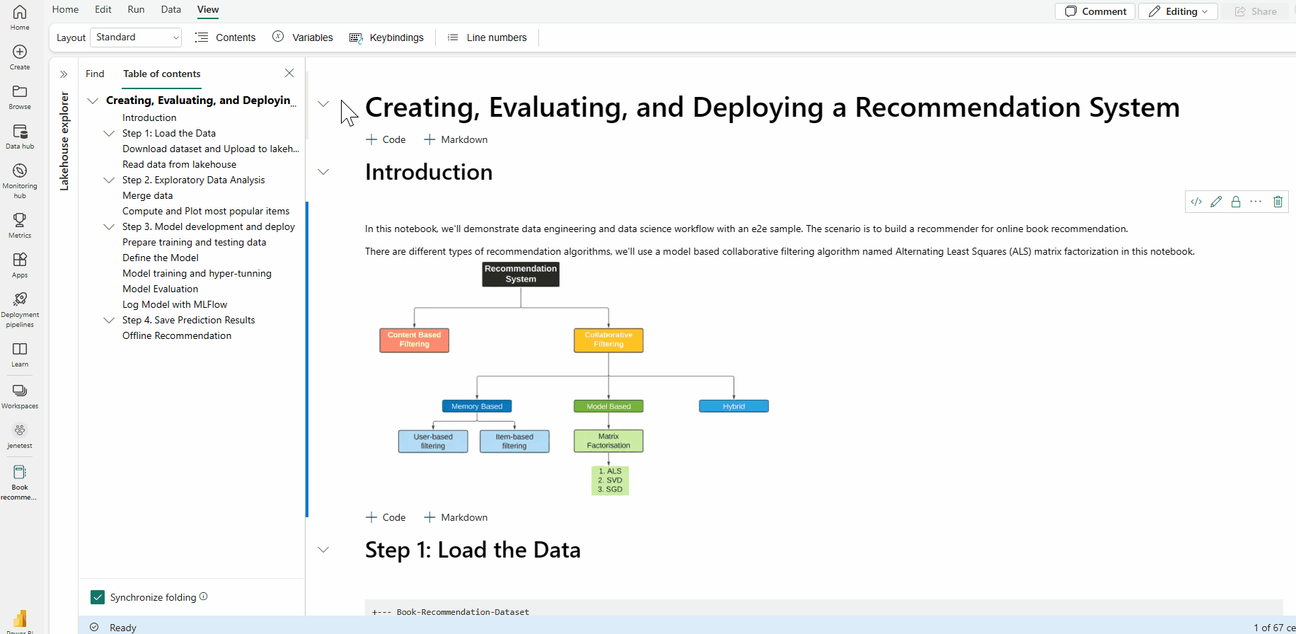 Selecting Outlines or Table of Contents presents the first markdown header of any markdown cell in a sidebar window for quick navigation. The Outlines sidebar is resizable and collapsible to fit the screen in the best way possible. Select the Contents button on the notebook command bar to open or hide the sidebar.