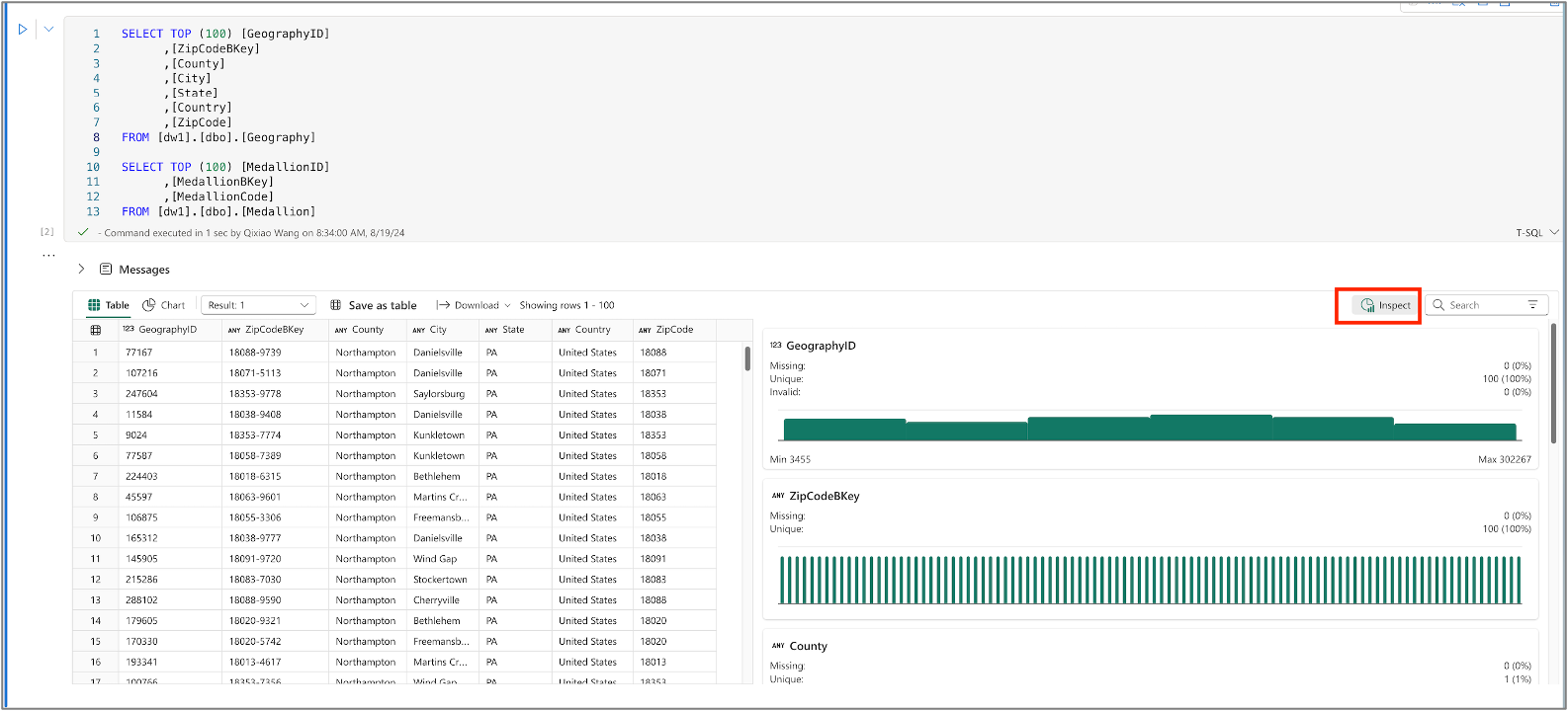 By clicking on the Inspect, you can see the charts which represent the data quality and distribution of each column