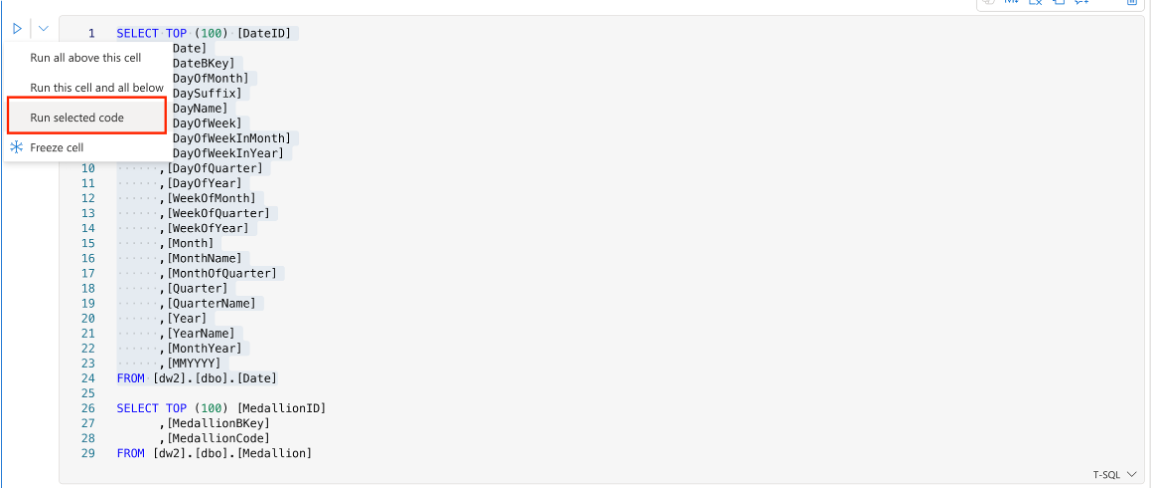 You can run one T-SQL code cell by selecting the Run button in the cell toolbar or run all cells by selecting the Run all button in the toolbar.
