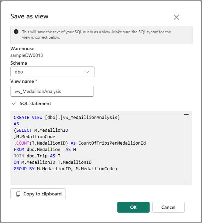 Similarly, you can create a view from your selected query text using Save as view menu in the cell command bar.