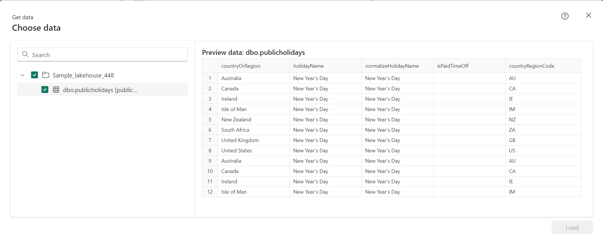 With your Microsoft Entra app registered, you need a GraphQL API in Fabric to query. This section walks you through creating a sample API using Fabric's public holidays dataset. This gives you a working API to test authentication and data retrieval without needing to configure your own data sources.
