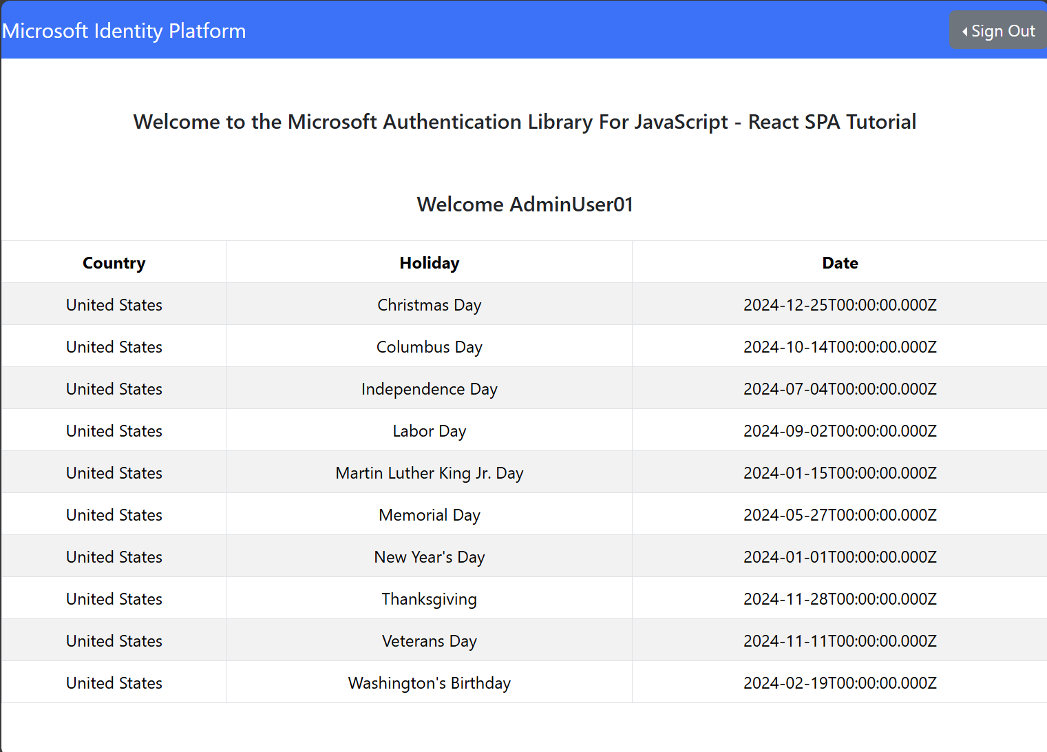 If everything is configured correctly, the application displays public holidays in a table. This confirms that: