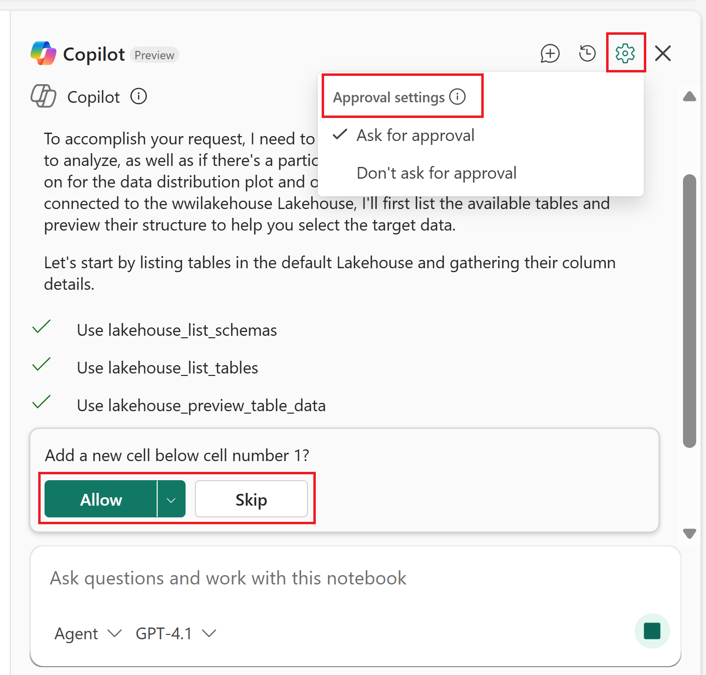 Copilot includes approval settings that control whether it asks for confirmation before running cells. To change approval settings, select the settings gear icon in the chat pane.