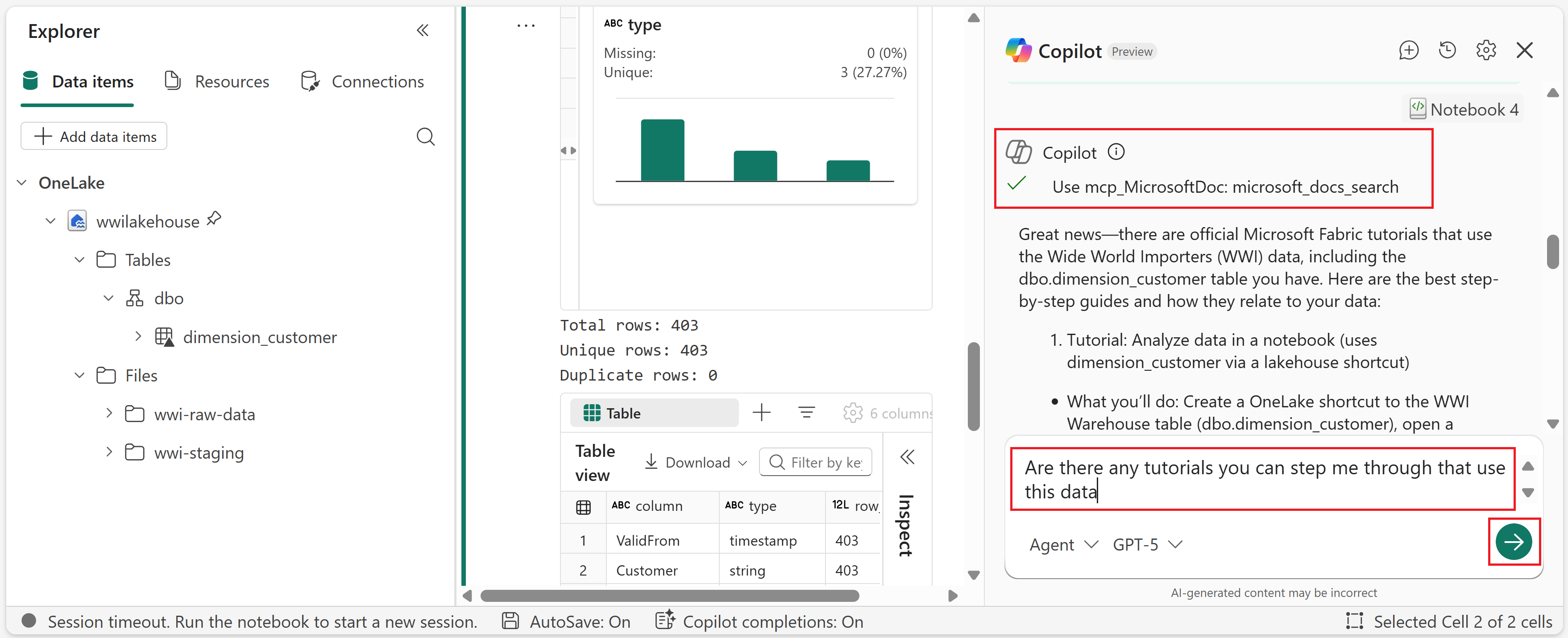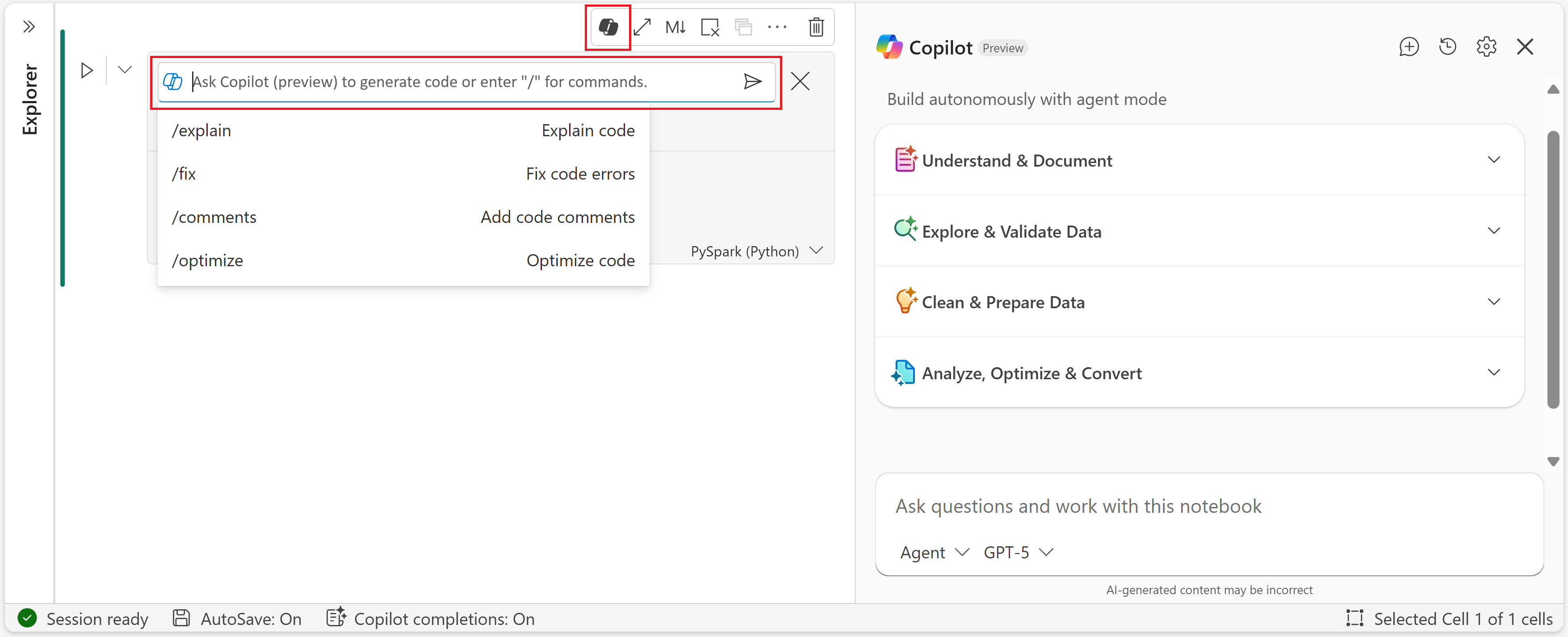 Copilot supports notebook-wide, multi-step code generation, refactoring, summarization, and validation across entire workflows, not just single cells or isolated prompts. It can coordinate changes across multiple cells in a session, helping you build and optimize end-to-end pipelines without losing context.