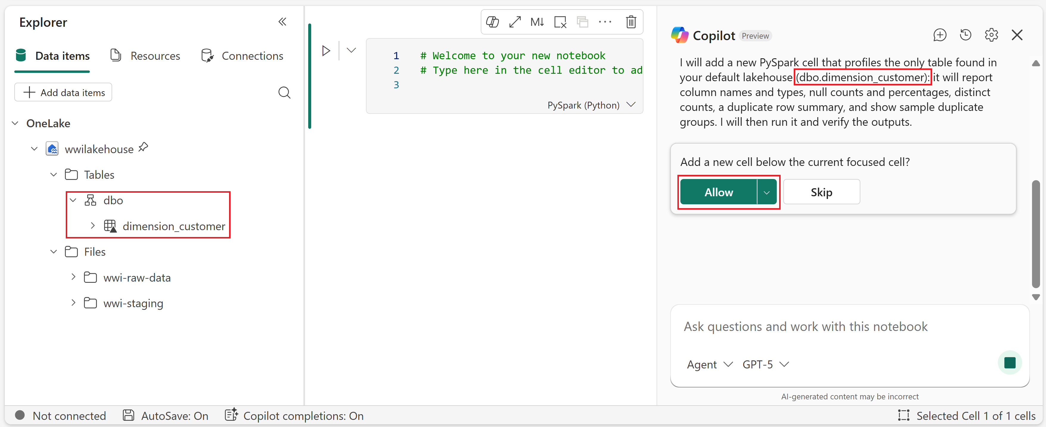Copilot finds the dimension_customer table in the default Lakehouse and requests permission to add a new code cell.