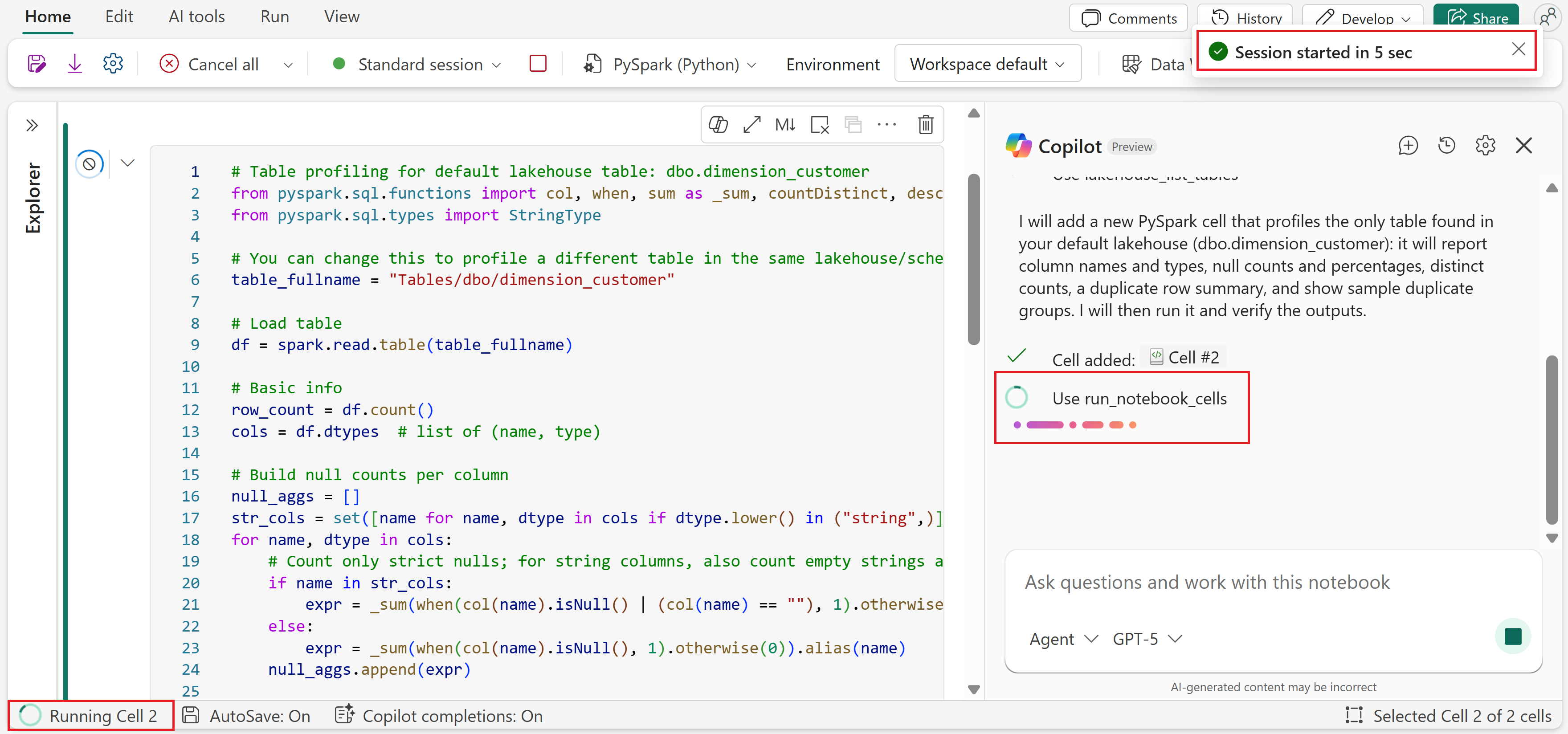 After you approve, the Spark session starts and Copilot runs the code cell it created.