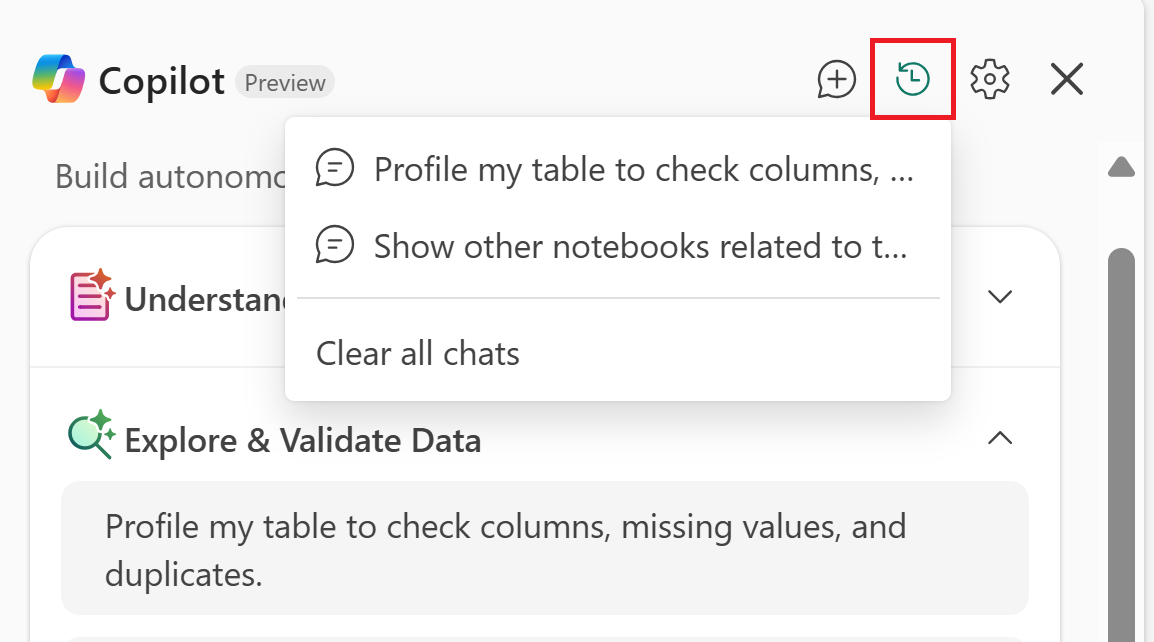 This walkthrough covers the core chat pane flow. The chat pane also supports chat history for reviewing previous conversations, and you can interact with Copilot directly within cells using in-cell Copilot for tasks like fixing, explaining, or optimizing code.