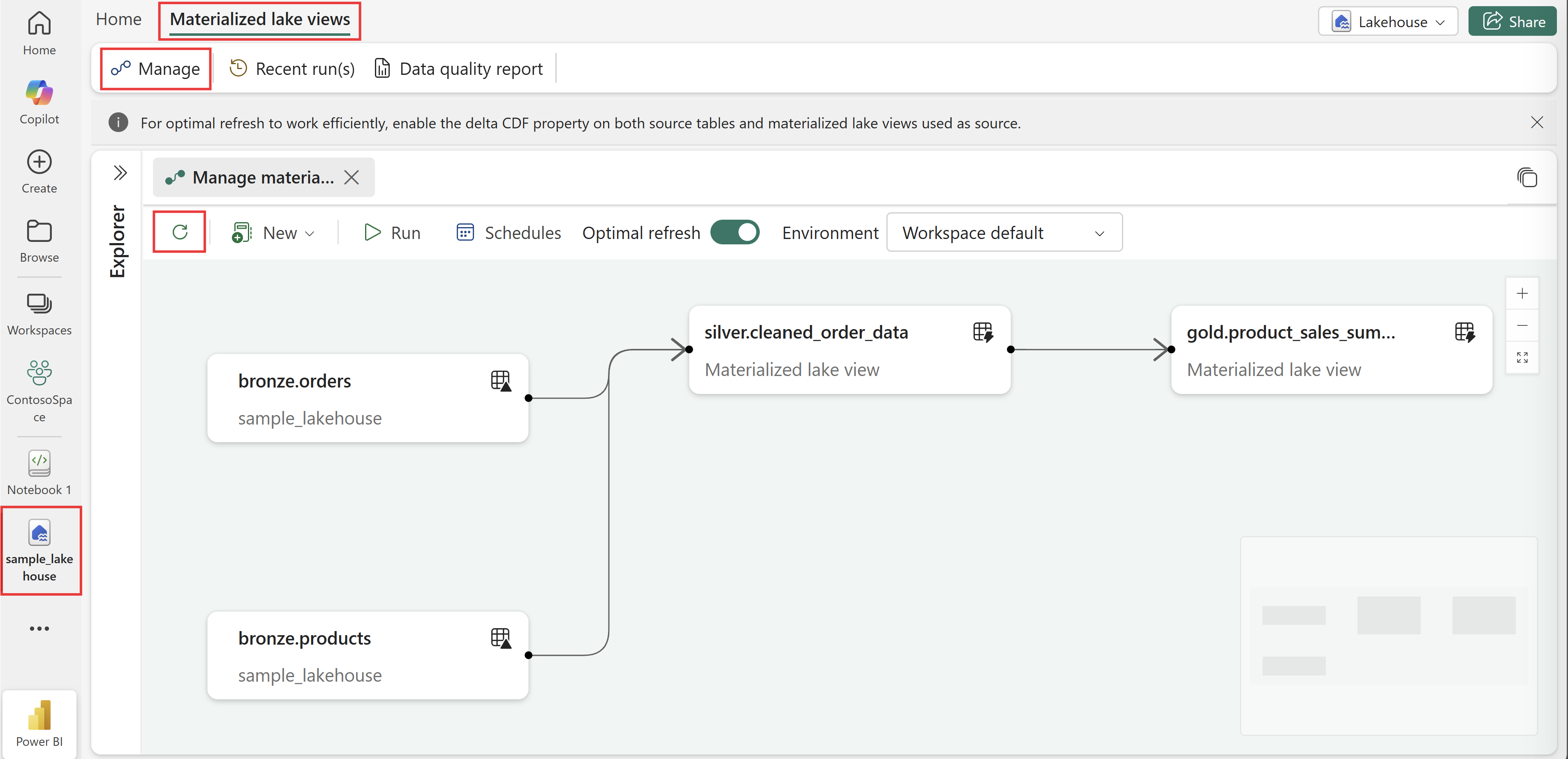 CREATE SCHEMA IF NOT EXISTS silver; CREATE MATERIALIZED LAKE VIEW IF NOT EXISTS silver.cleaned_order_data AS SELECT o.order_id, o.order_date, o.product_id, p.product_name, o.quantity, p.price, o.quantity * p.price AS revenue FROM bronze.orders o JOIN bronze.products p ON o.product_id = p.product_id; CREATE SCHEMA IF NOT EXISTS GOLD; CREATE MATERIALIZED LAKE VIEW IF NOT EXISTS gold.product_sales_summary AS SELECT product_id, product_name, SUM(quantity) AS total_quantity_sold, SUM(revenue) AS total_revenue, ROUND(AVG(revenue), 2) AS average_order_value FROM silver.cleaned_order_data GROUP BY product_id, product_name;Refresh the Lakehouse explorer to view the newly created materialized lake views