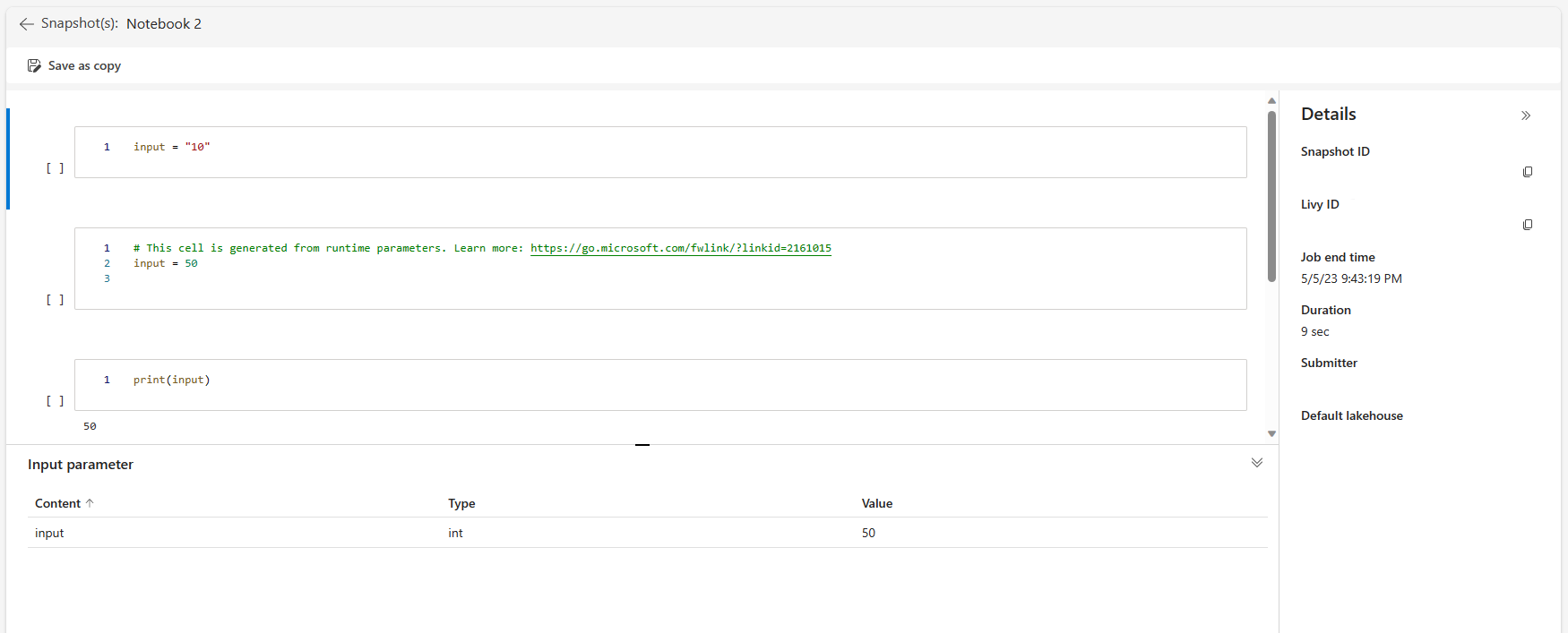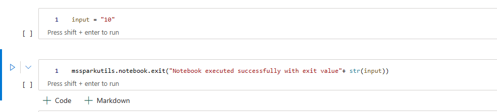 mssparkutils.notebook.run("Sample1", 90, {"input": 20 }, "fe0a6e2a-a909-4aa3-a698-0a651de790aa")