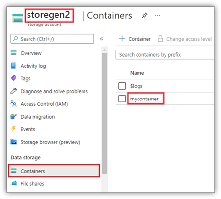 This example assumes that you have one Data Lake Storage Gen2 account named storegen2, and the account has one container named mycontainer that you want to mount to /test into your notebook Spark session.