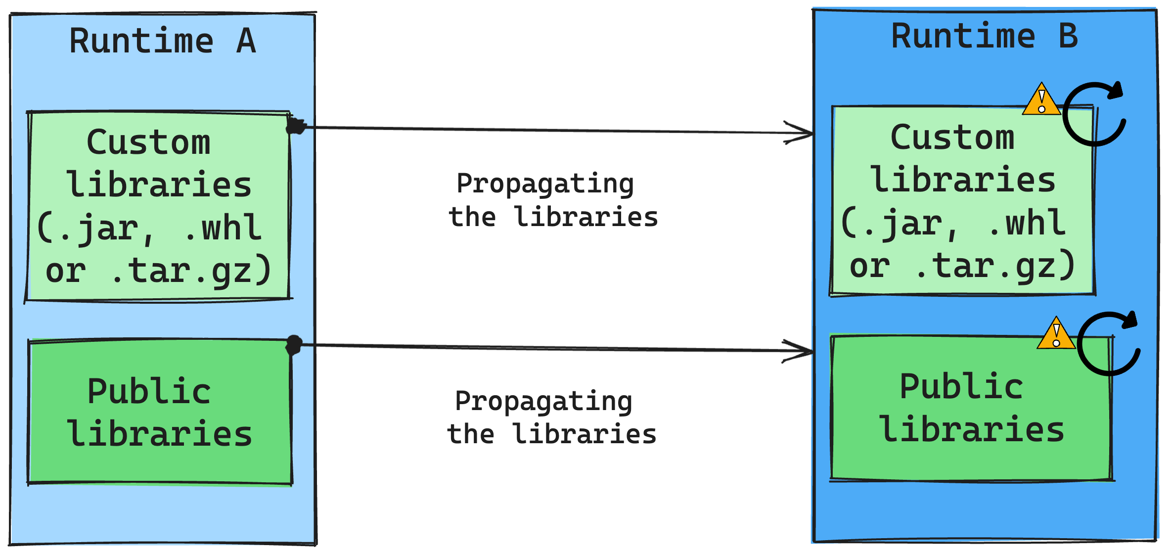 The user is responsible for updating or replacing any libraries that don't work with Runtime B. If there's a conflict, which means that Runtime B includes a library originally defined in Runtime A, our library management system tries to create the necessary dependency for Runtime B based on the user's settings. However, the building process fails if a conflict occurs. In the error log, users can see which libraries are causing conflicts and make adjustments to their versions or specifications.