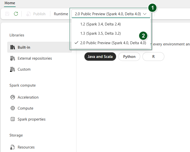 Additionally, to change runtime at the Environment item level, create a new Environment item or open and existing one, under the Runtime dropdown, select your desired runtime version from the available options, select Save and then Publish your changes. Next, you can use this Environment item with your Notebook or Spark Job Definition.