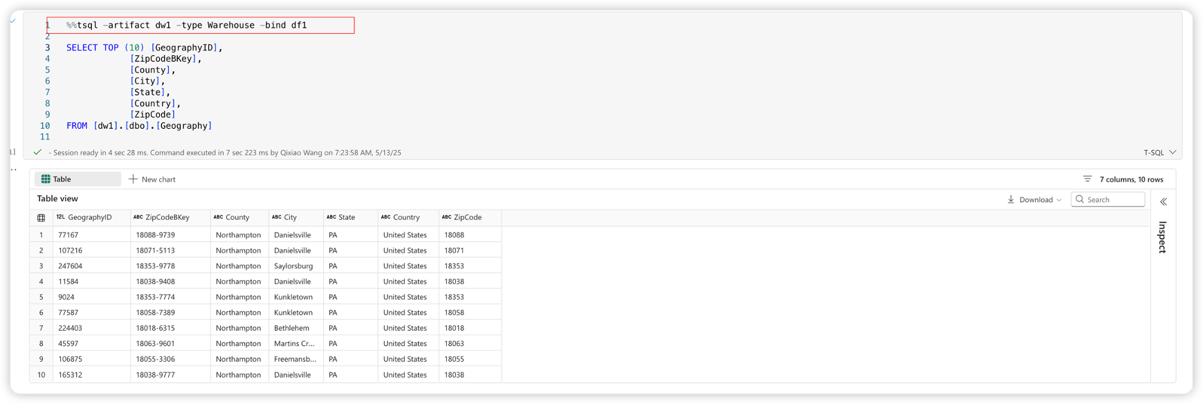%tsqlin following cells. The line magic will use the connection established in step 1 without requiring you to specify-artifactand-typeagain. For example:df = %tsql SELECT TOP(10) * FROM [ContosoDWH].[dbo].[Geography];