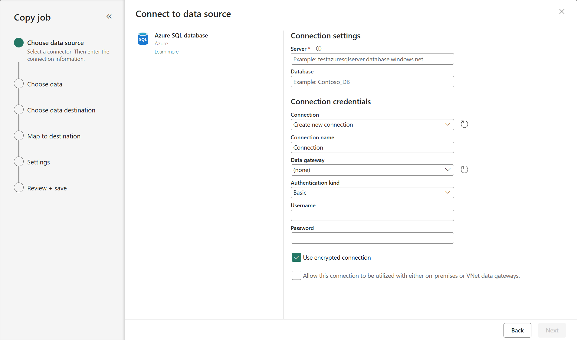 For Azure SQL DB enter your server path and credentials. You can copy data securely within a virtual network environment using on-premises or virtual network gateway. For other databases, the connection details will vary.