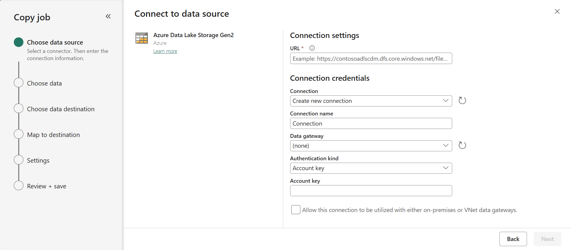 To connect to Azure Data Lake Storage Gen2, enter your Storage url and Credentials to connect to Azure Data Lake Storage Gen2. For other data stores, the connection details will vary. You can copy data securely within a virtual network environment using on-premises or virtual network gateway.