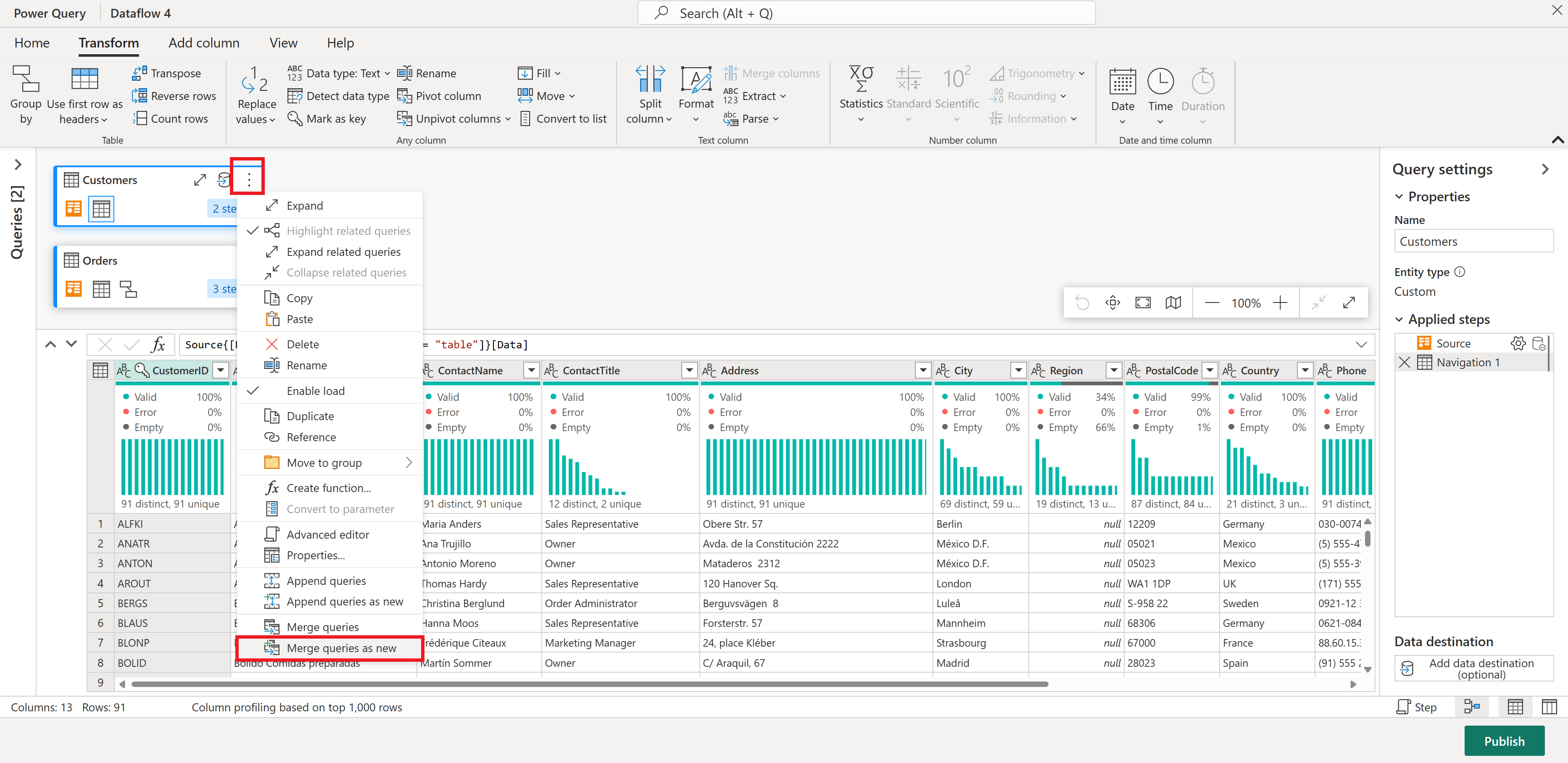 Within the Orders table, calculate the total number of orders per customer: Select the CustomerID column in the data preview and then select Group By under the Transform tab in the ribbon.