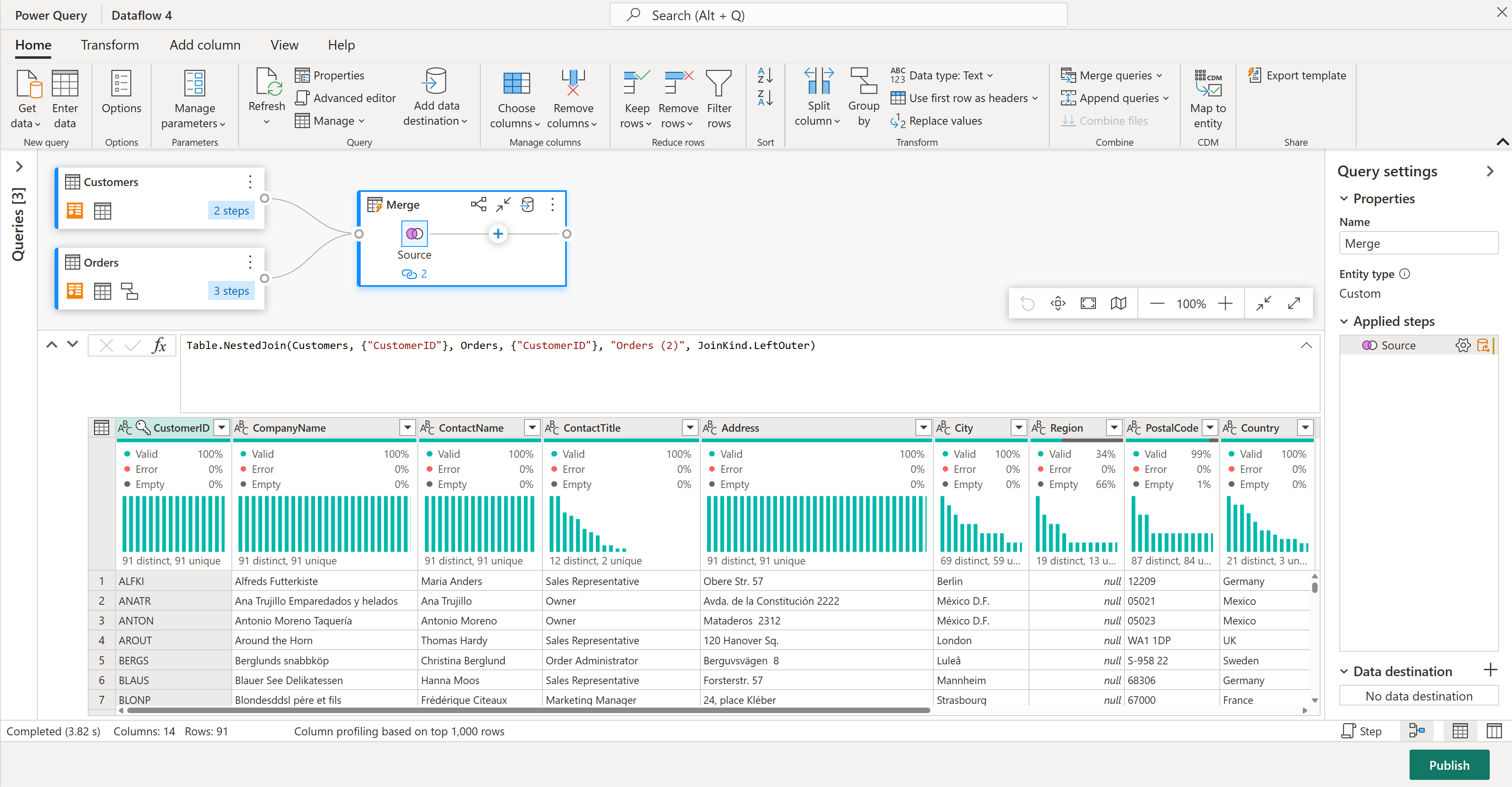 Now there's a new query with all columns from the Customers table and one column with nested data from the Orders table.