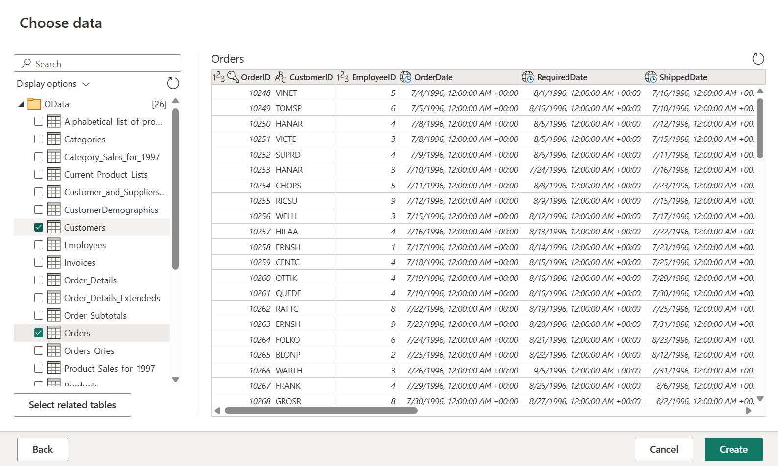 https://services.odata.org/v4/northwind/northwind.svc/, and then select Next.