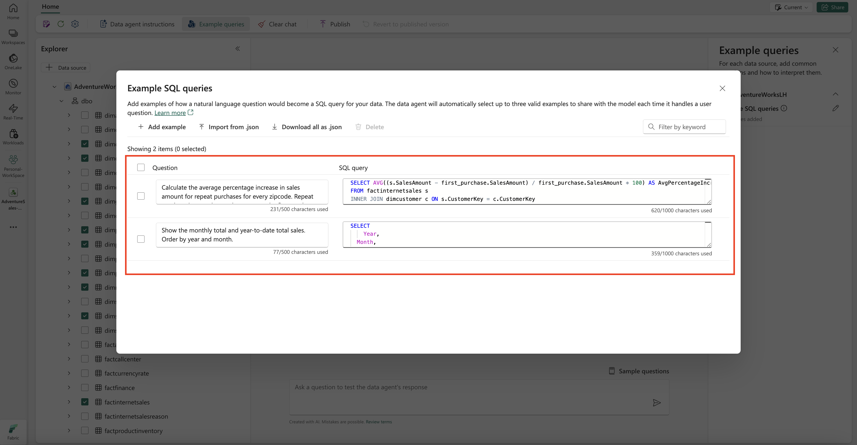 Here, you should add Example queries for the lakehouse data source that you created.