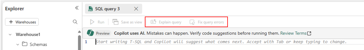 There are two AI-powered quick actions that are currently supported for Copilot in Fabric in Data Warehouse: Explain and Fix.